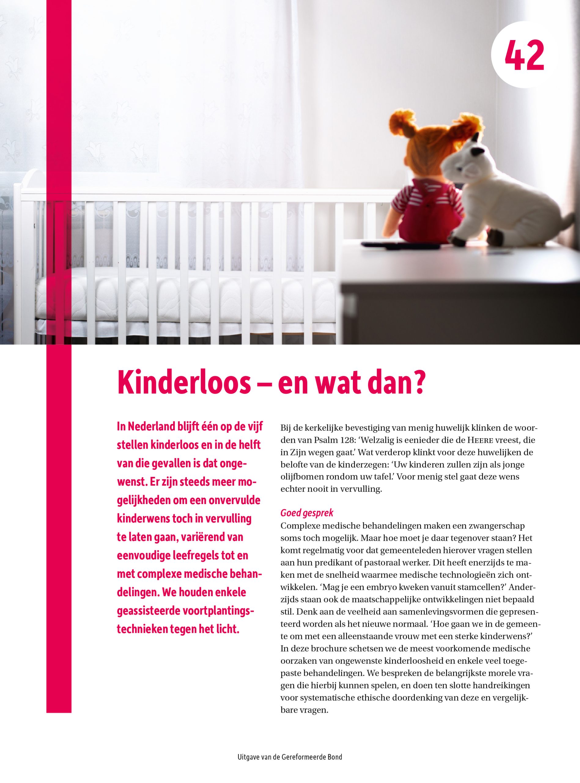 Stef Groenewoud, bijzonder hoogleraar Medische Ethiek, en Arthur Alderliesten, directeur van stichting Schreeuw om leven, houden in Kinderloos – en wat dan?, de themabrochure die op 13 juni 2024 bij De Waarheidsvriend is gevoegd, enkele geassisteerde voortplantingstechnieken tegen het licht. Ze behandelen de meest voorkomende medische oorzaken van ongewenste kinderloosheid en leggen uit hoe enkele veel toegepaste behandelingen in zijn werk gaan. Verder geven ze enkele handreikingen waarmee je kunt beoordelen of je die als christen ook kunt benutten. Een van hun morele afwegingen: ‘Uit een bijbelse visie op het huwelijk volgt dat toepassing van geassisteerde voortplantingstechnieken buiten die relatie (denk aan alleenstaanden, meerouderschap, ouders van het gelijke geslacht) daarmee niet verenigbaar zijn.’